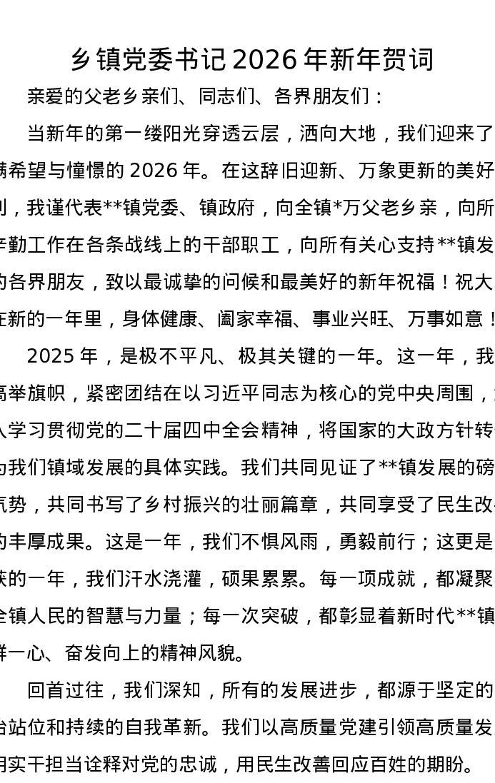 乡镇党委书记2026年新年贺词