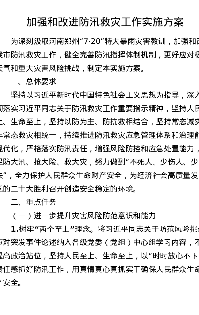 加强和改进防汛救灾工作实施方案