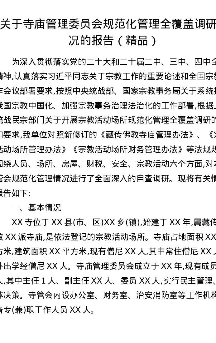 关于寺庙管理委员会规范化管理全覆盖调研情况的报告