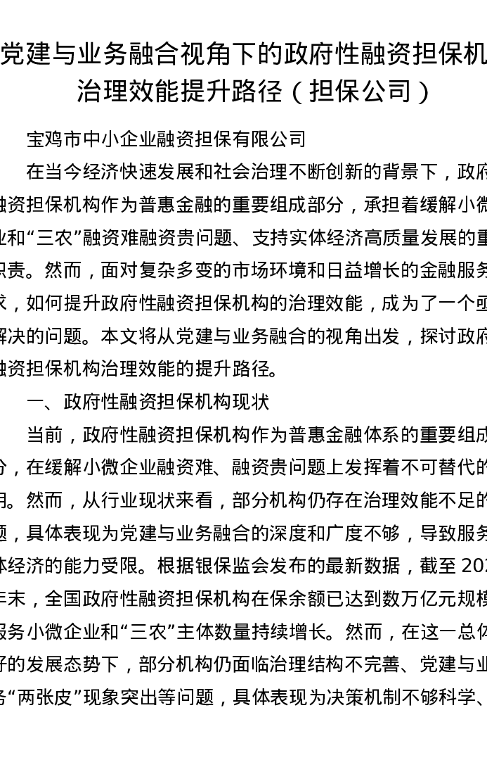 调研报告:党建与业务融合视角下的政府性融资担保机构治理效能提升路径(担保公司)