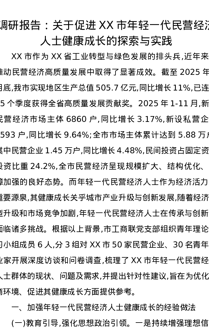 调研报告:关于促进XX市年轻一代民营经济人士健康成长的探索与实践