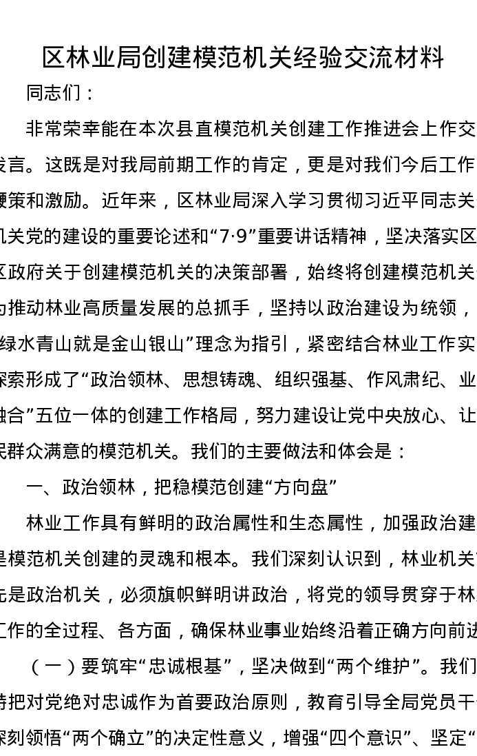 区林业局创建模范机关经验交流发言材料