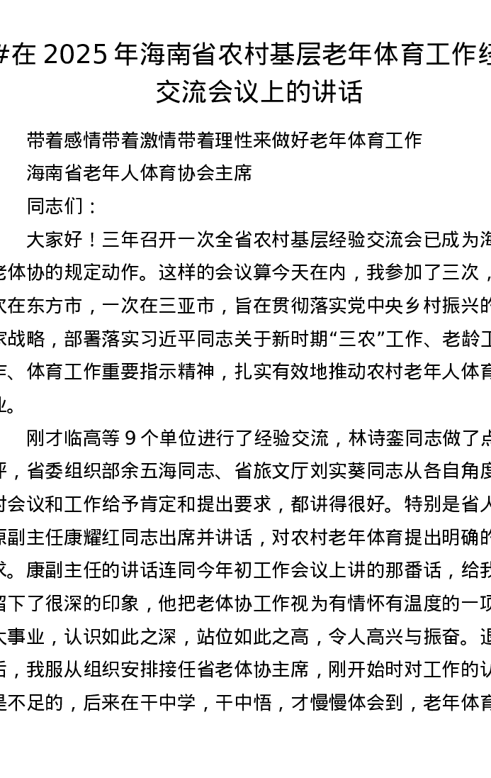 在2025年海南省农村基层老年体育工作经验交流会议上的讲话