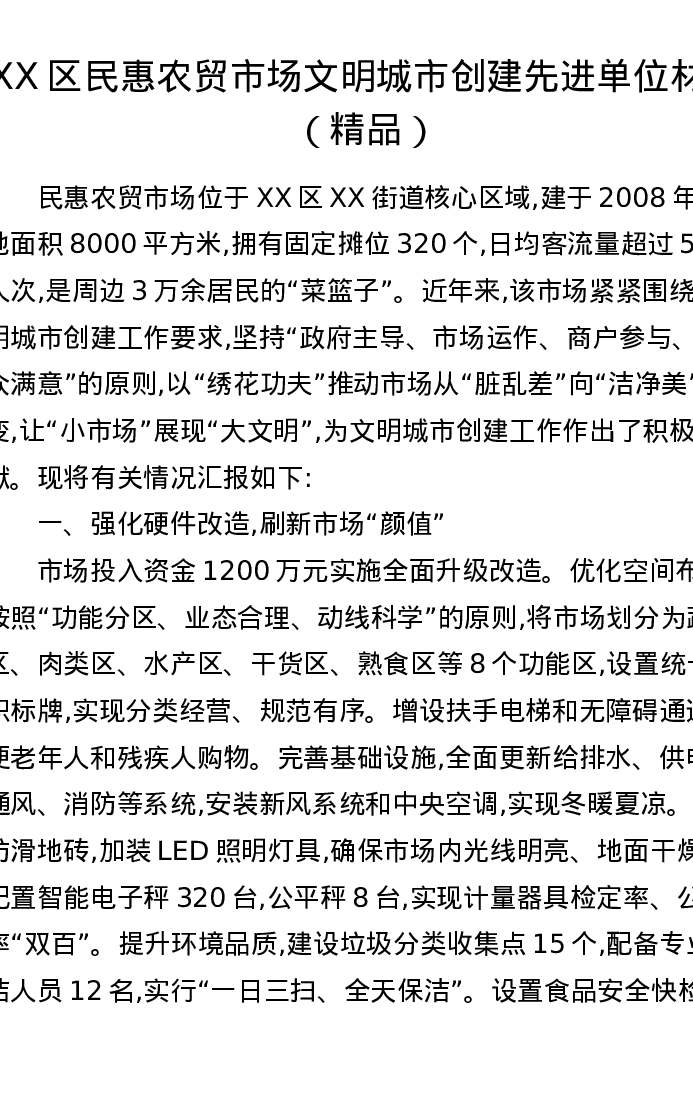 XX区民惠农贸市场文明城市创建先进单位材料