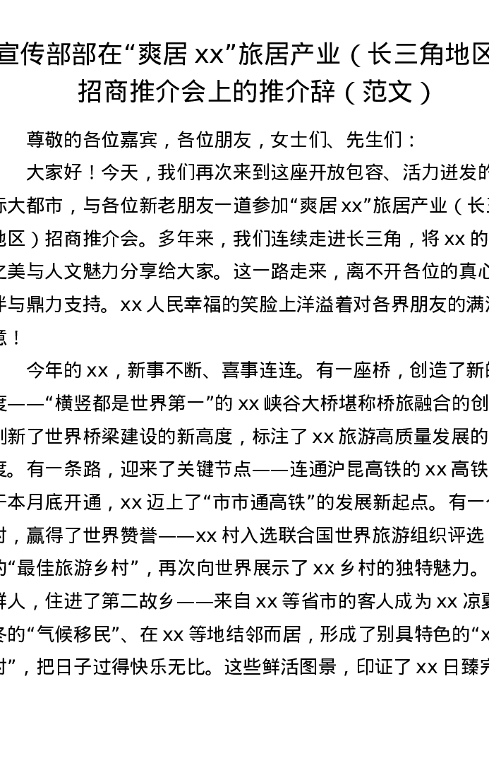 宣传部部在爽居xx旅居产业(长三角地区)招商推介会上的推介辞(范文)