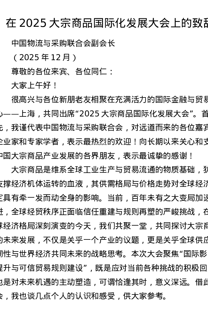 在2025大宗商品国际化发展大会上的致辞