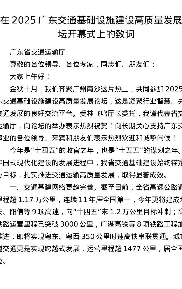 在2025广东交通基础设施建设高质量发展论坛开幕式上的致词