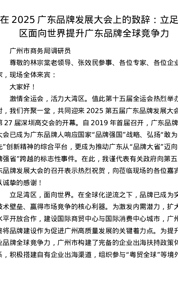 在2025广东品牌发展大会上的致辞:立足湾区面向世界提升广东品牌全球竞争力