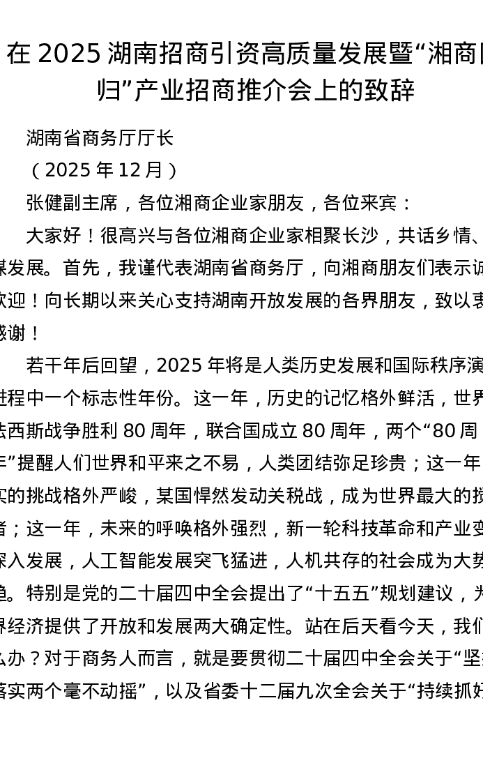 在2025湖南招商引资高质量发展暨湘商回归产业招商推介会上的致辞