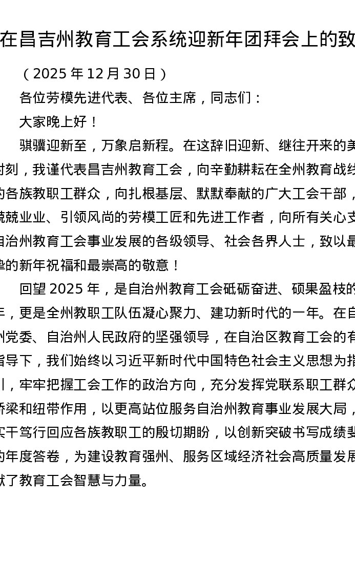 在昌吉州教育工会系统迎新年团拜会上的致辞