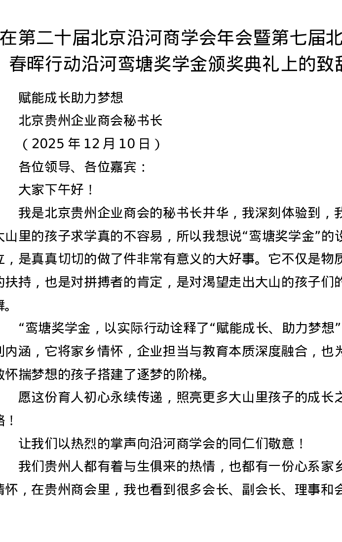 在第二十届北京沿河商学会年会暨第七届北京春晖行动沿河鸾塘奖学金颁奖典礼上的致辞