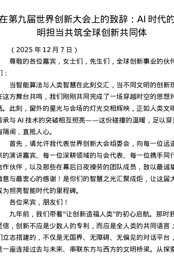 在第九届世界创新大会上的致辞:AI时代的文明担当共筑全球创新共同体