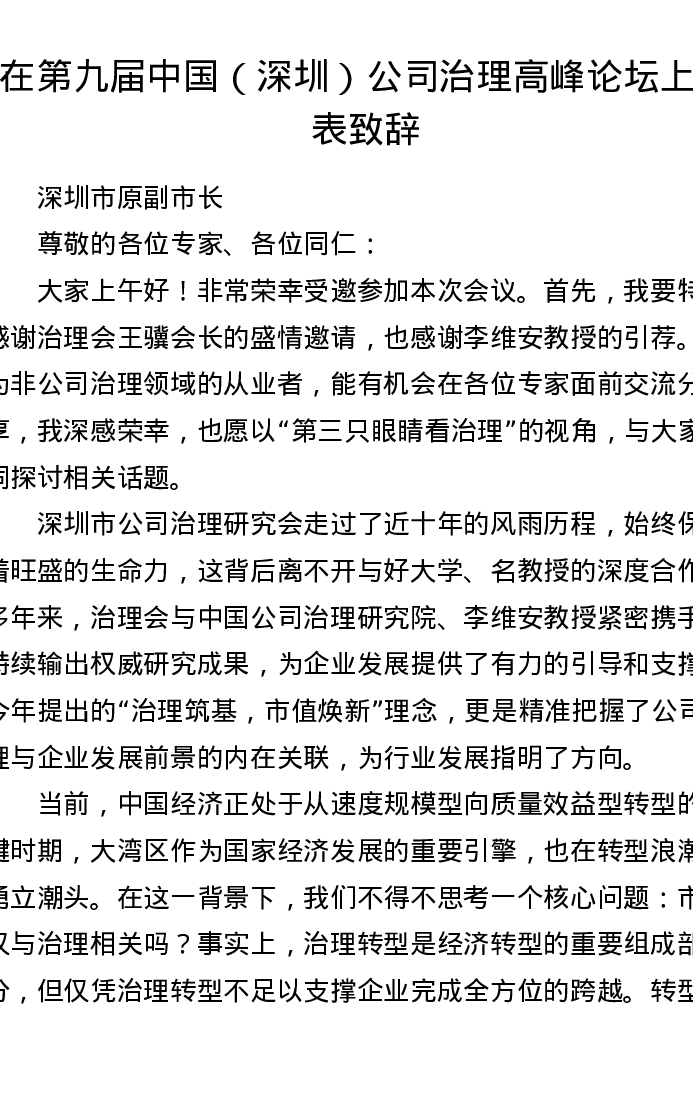 在第九届中国(深圳)公司治理高峰论坛上发表致辞