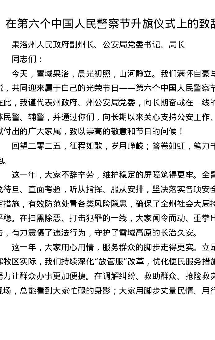 在第六个中国人民警察节升旗仪式上的致辞