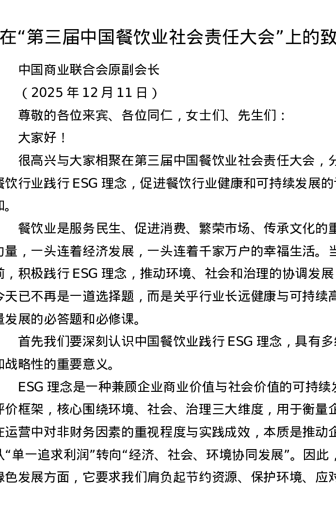在第三届中国餐饮业社会责任大会上的致辞