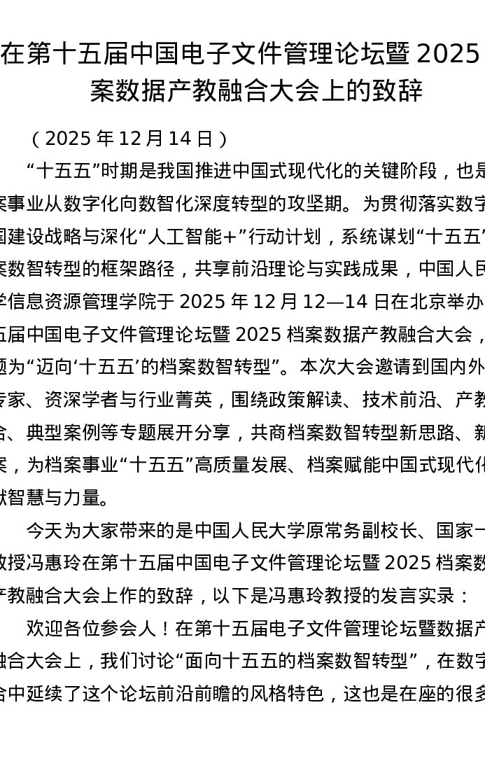 在第十五届中国电子文件管理论坛暨2025档案数据产教融合大会上的致辞