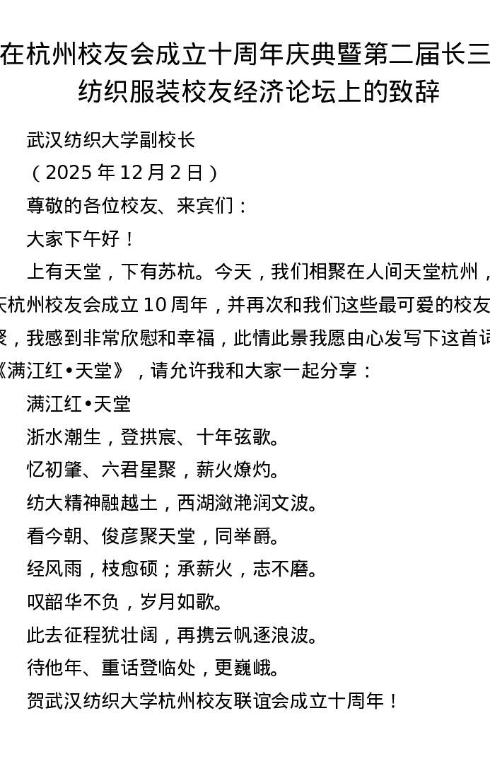 在杭州校友会成立十周年庆典暨第二届长三角纺织服装校友经济论坛上的致辞