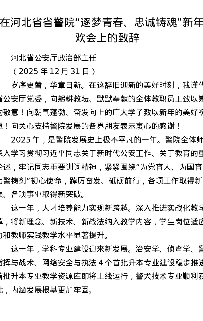 在河北省省警院逐梦青春、忠诚铸魂新年联欢会上的致辞