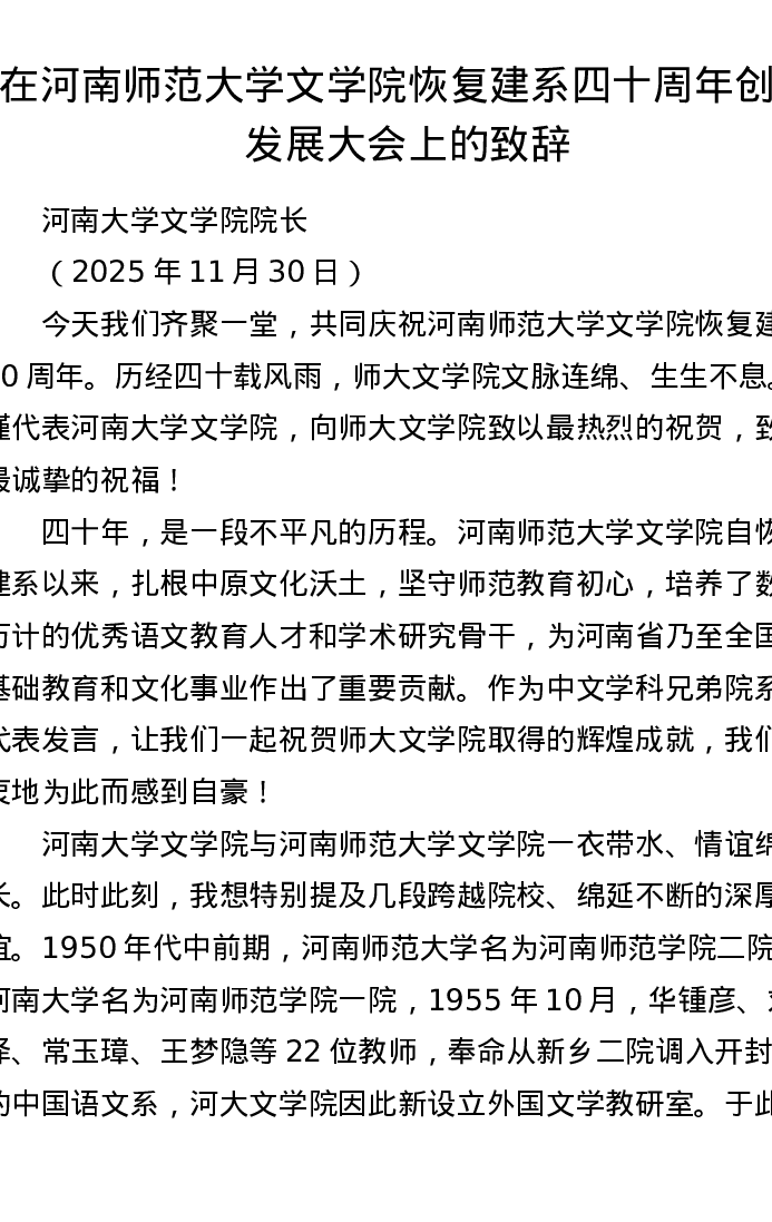 在河南师范大学文学院恢复建系四十周年创新发展大会上的致辞