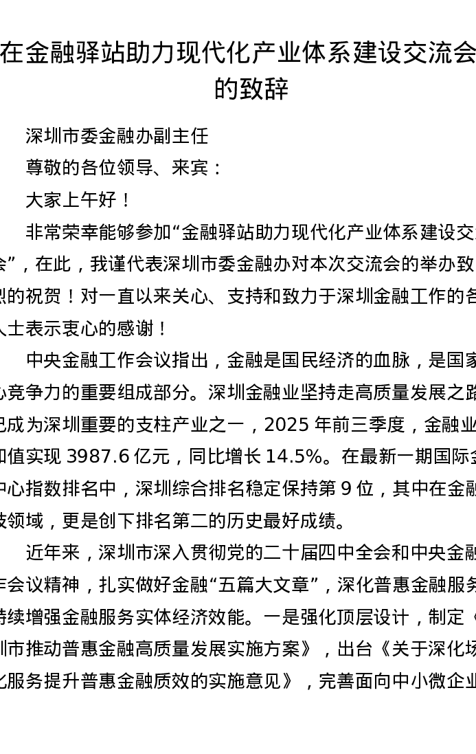 在金融驿站助力现代化产业体系建设交流会上的致辞