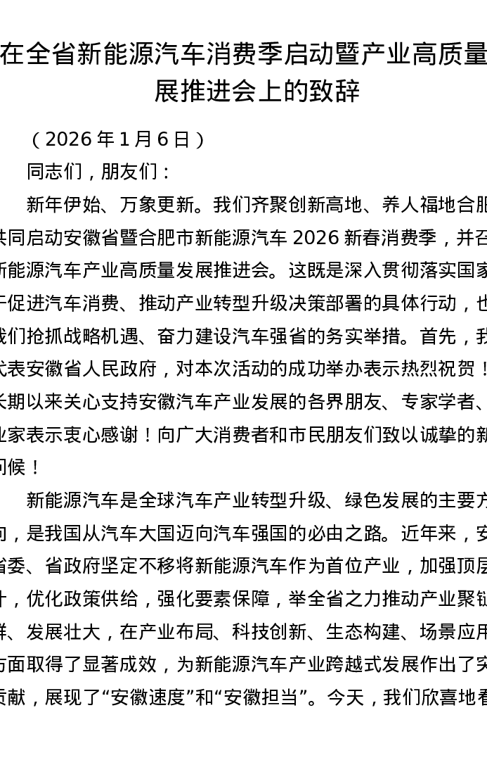 在全省新能源汽车消费季启动暨产业高质量发展推进会上的致辞