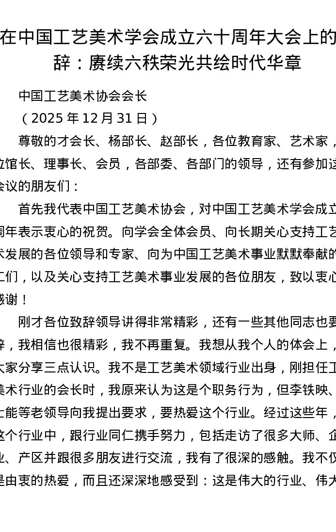 在中国工艺美术学会成立六十周年大会上的致辞:赓续六秩荣光共绘时代华章