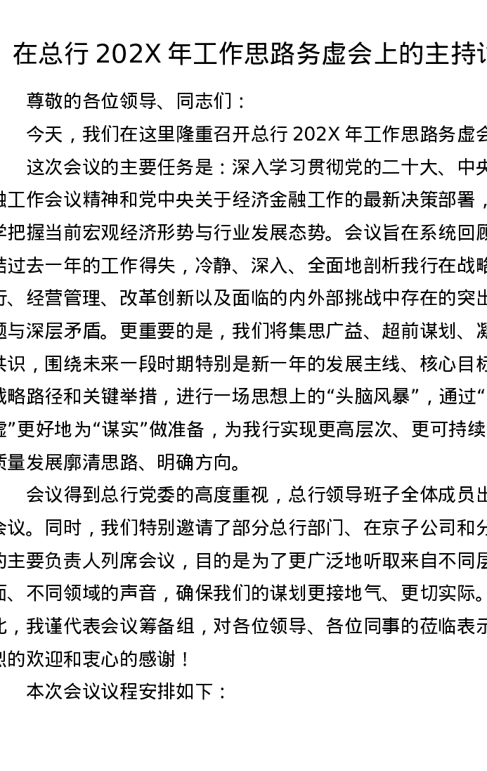 在总行202X年工作思路务虚会上的主持词