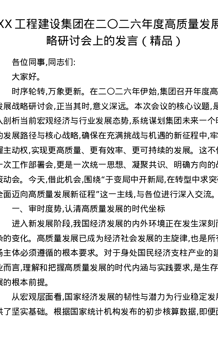 XX工程建设集团在二〇二六年度高质量发展战略研讨会上的发言