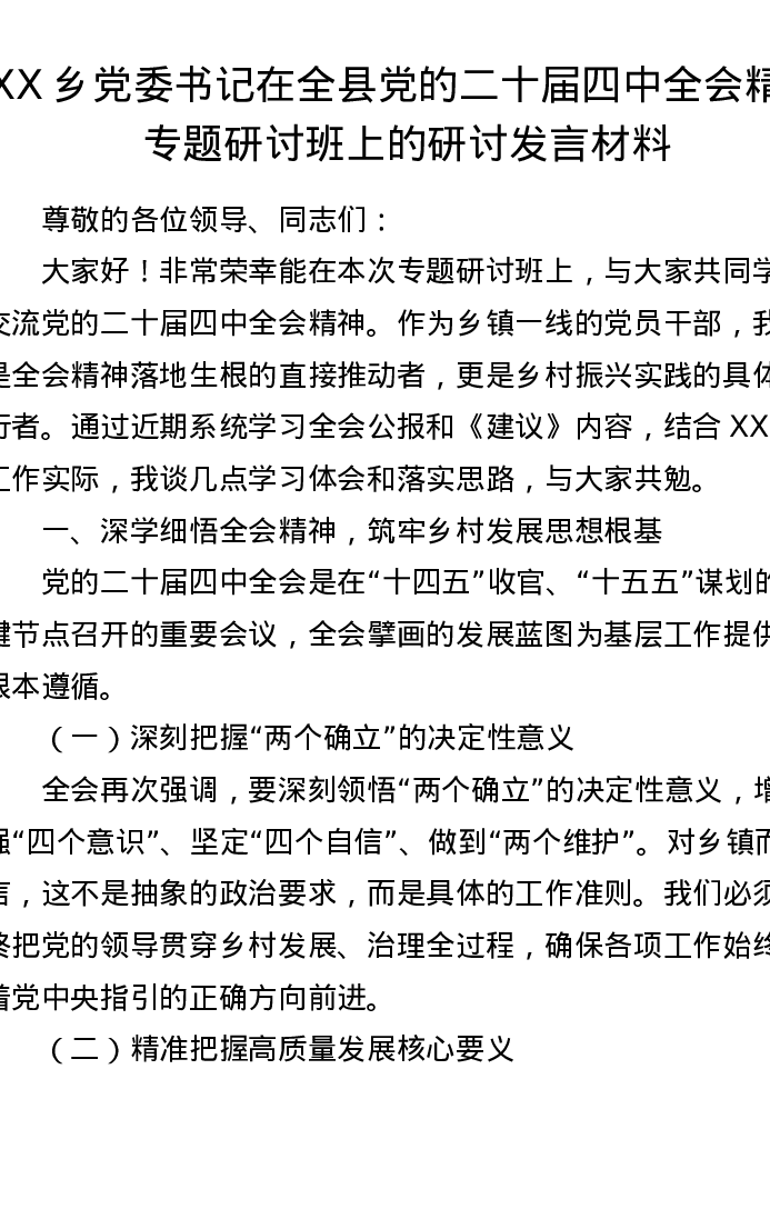 XX乡党委书记在全县党的二十届四中全会精神专题研讨班上的研讨发言材料