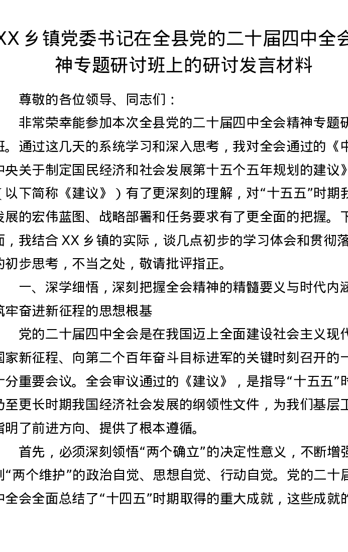 XX乡镇党委书记在全县党的二十届四中全会精神专题研讨班上的研讨发言材料