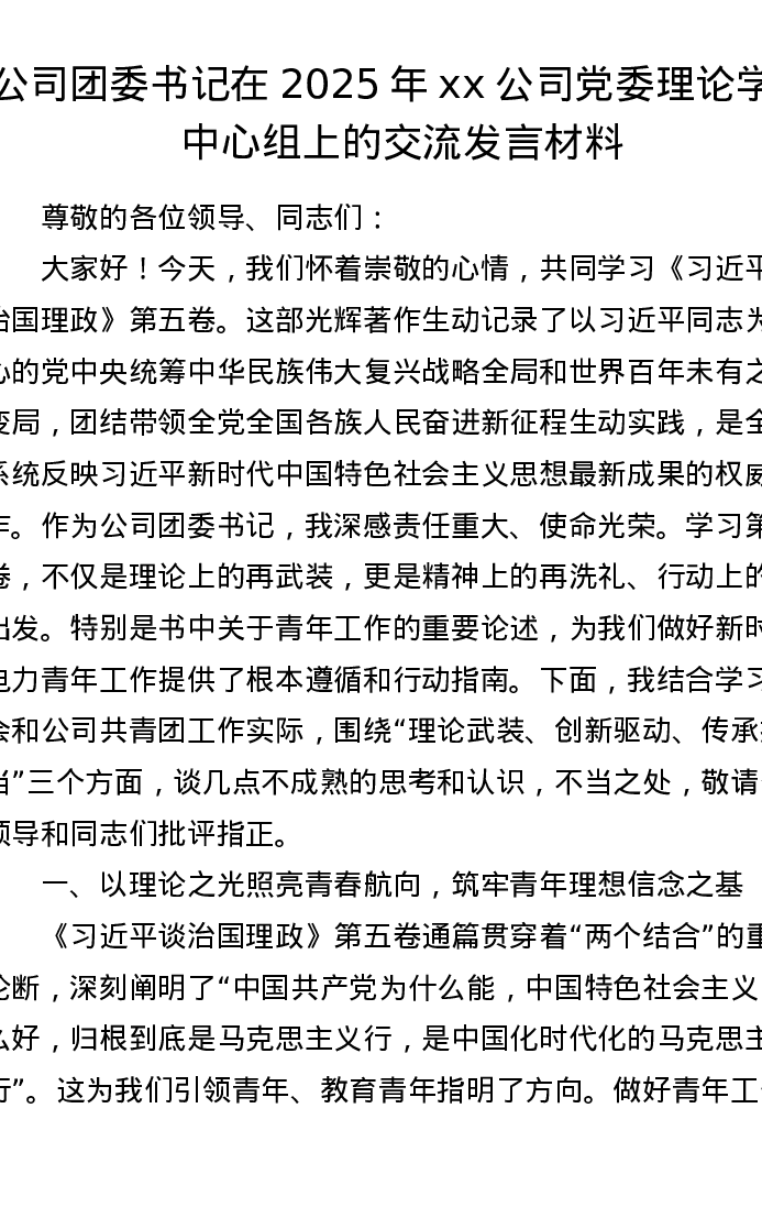 公司团委书记在2025年xx公司党委理论学习中心组上的交流发言材料