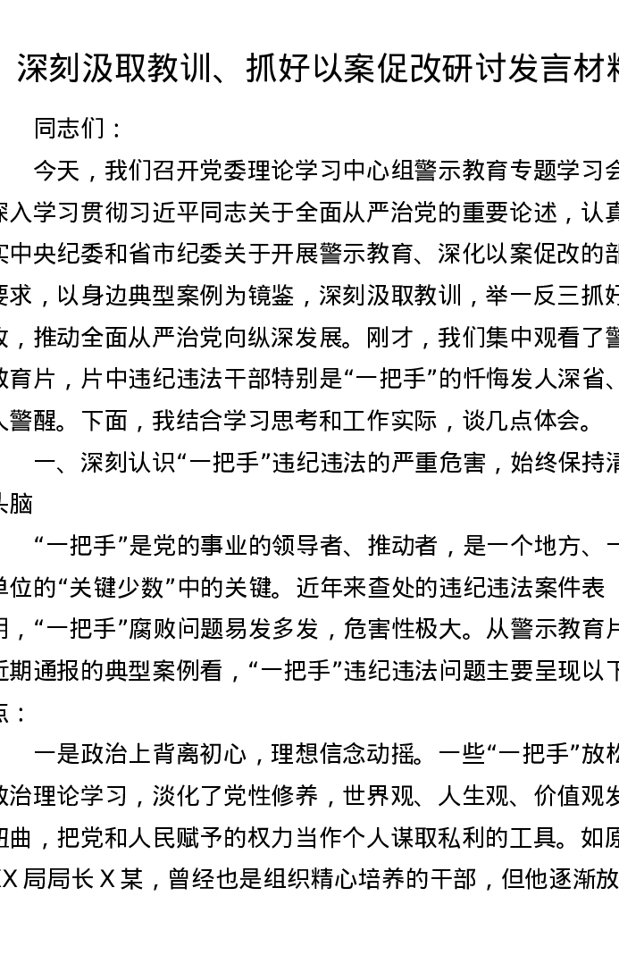 深刻汲取教训、抓好以案促改研讨发言材料