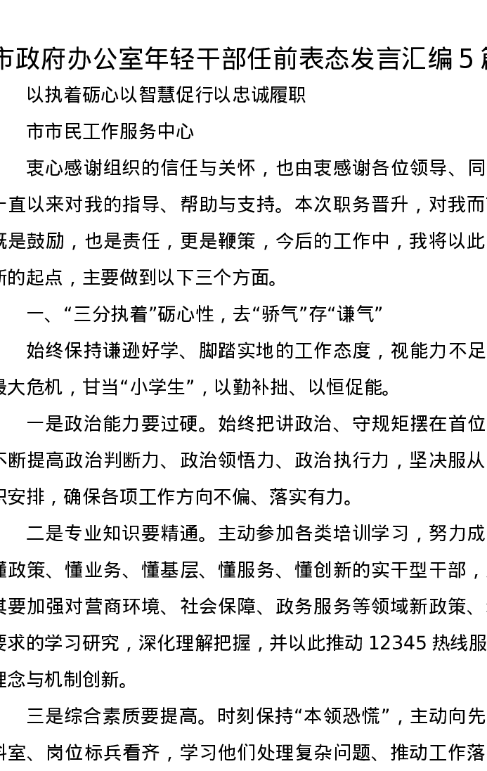 市政府办公室年轻干部任前表态发言汇编5篇