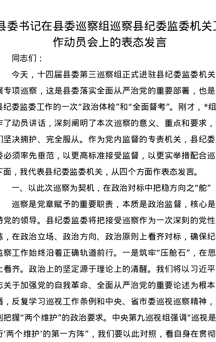 县委书记在县委巡察组巡察县纪委监委机关工作动员会上的表态发言