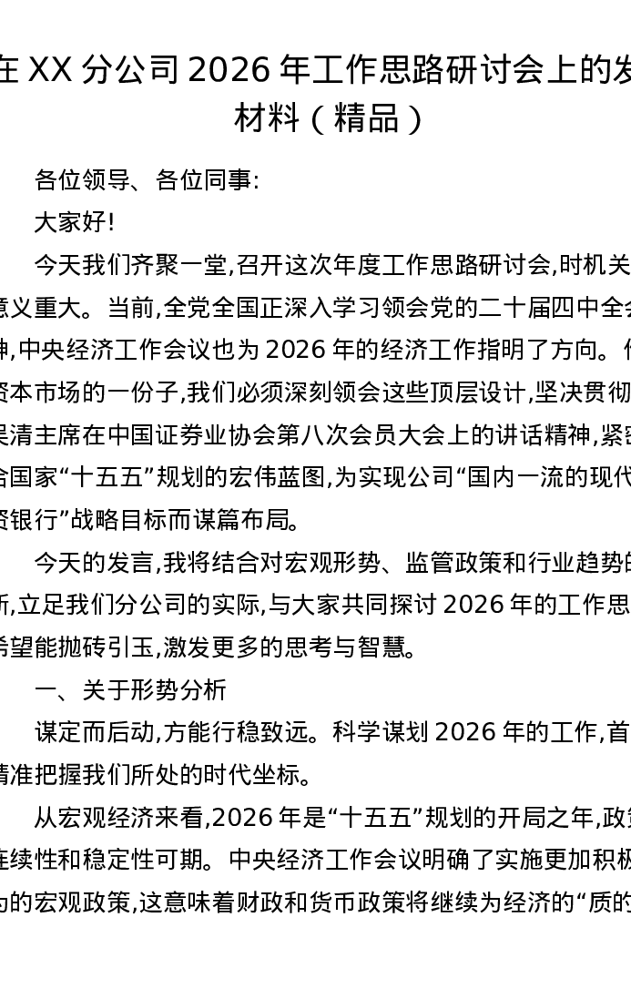 在XX分公司2026年工作思路研讨会上的发言材料