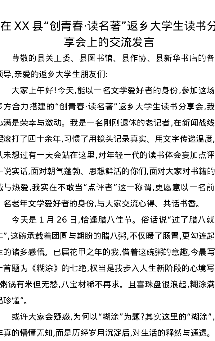 在XX县创青春·读名著返乡大学生读书分享会上的交流发言