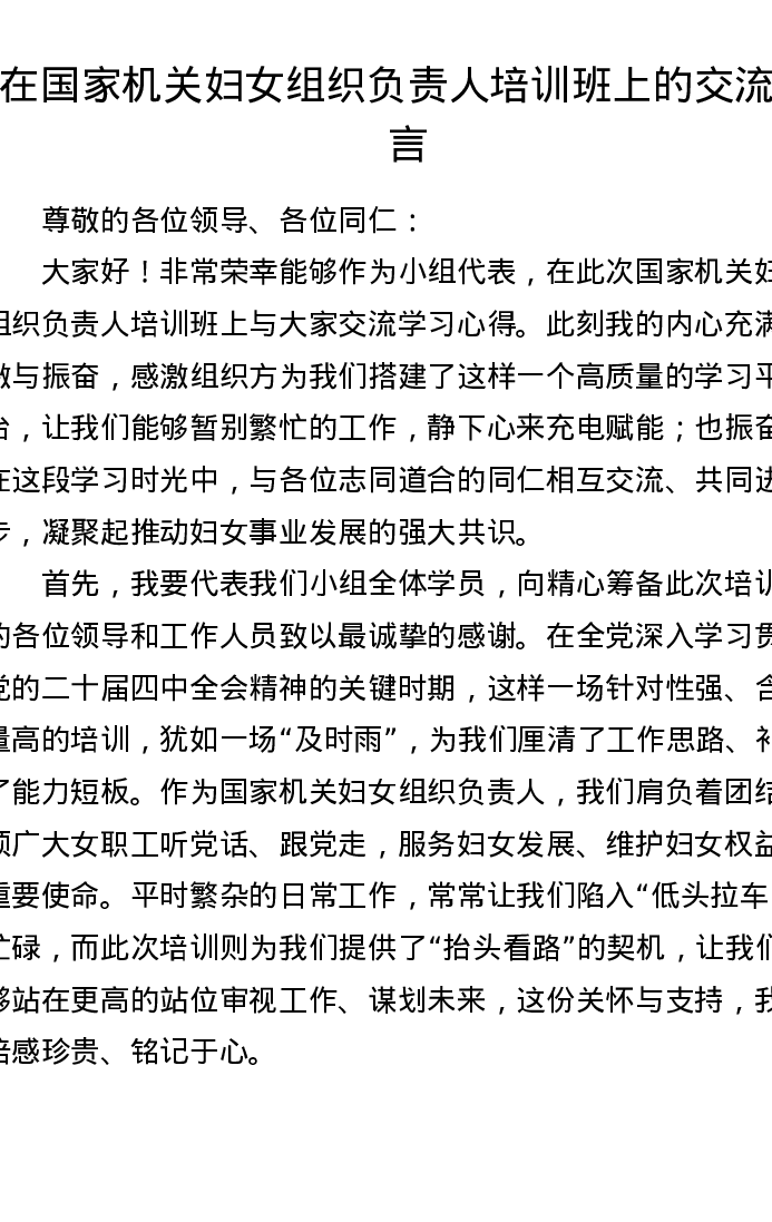 在国家机关妇女组织负责人培训班上的交流发言(3882字)