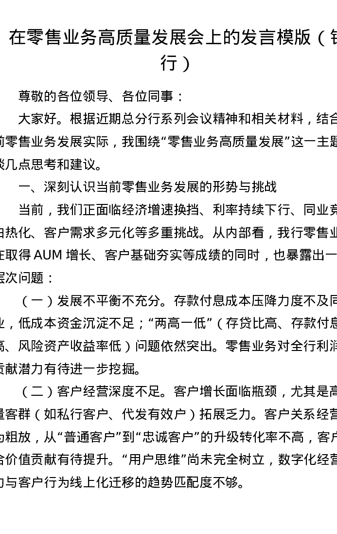 在零售业务高质量发展会上的发言模版(银行)