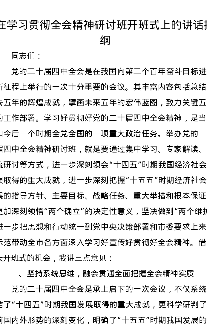 在学习贯彻全会精神研讨班开班式上的讲话提纲