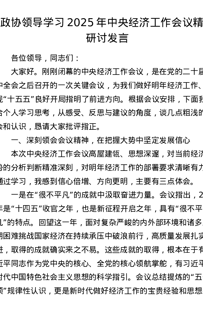 政协领导学习2025年中央经济工作会议精神研讨发言