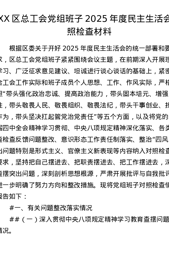 XX区总工会党组班子2025年度xxxxx对照检查材料(7392字)