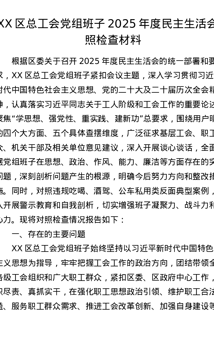 XX区总工会党组班子2025年度xxxxx对照检查材料