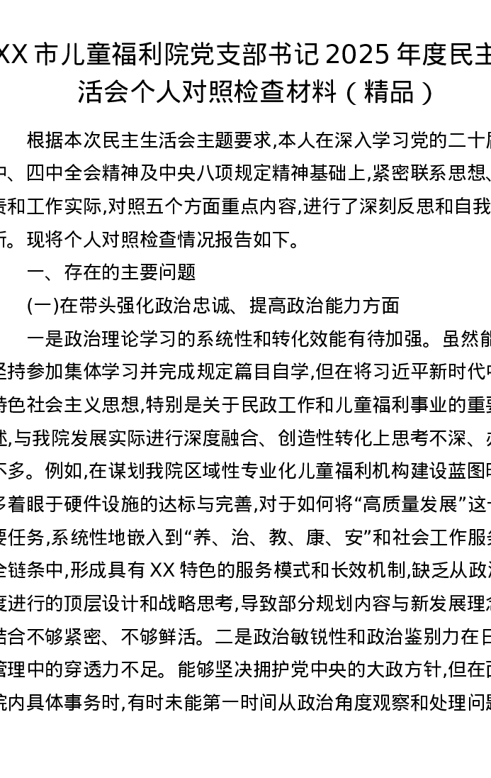 XX市儿童福利院党支部书记2025年度xxxxx个人对照检查材料