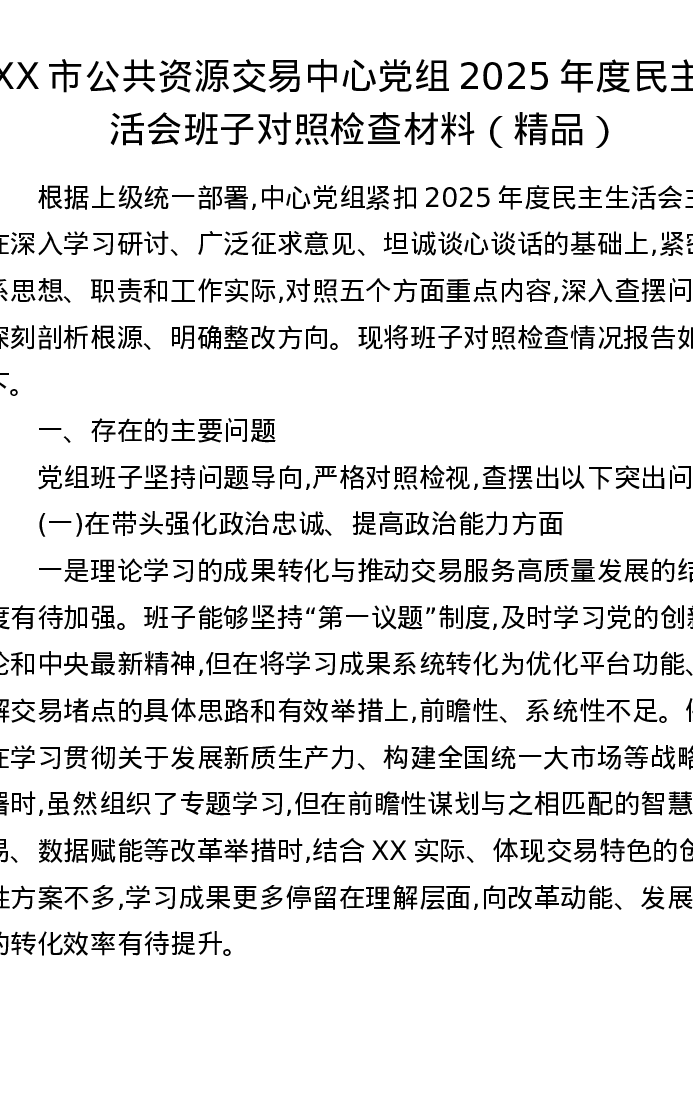 XX市公共资源交易中心党组2025年度xxxxx班子对照检查材料