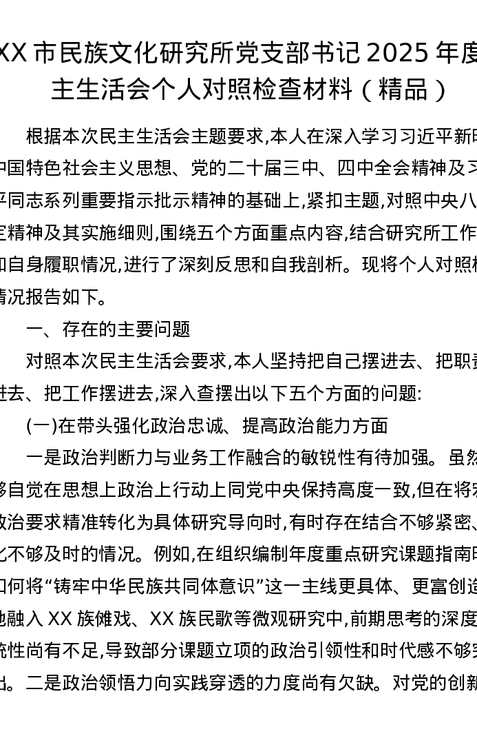 XX市民族文化研究所党支部书记2025年度xxxxx个人对照检查材料