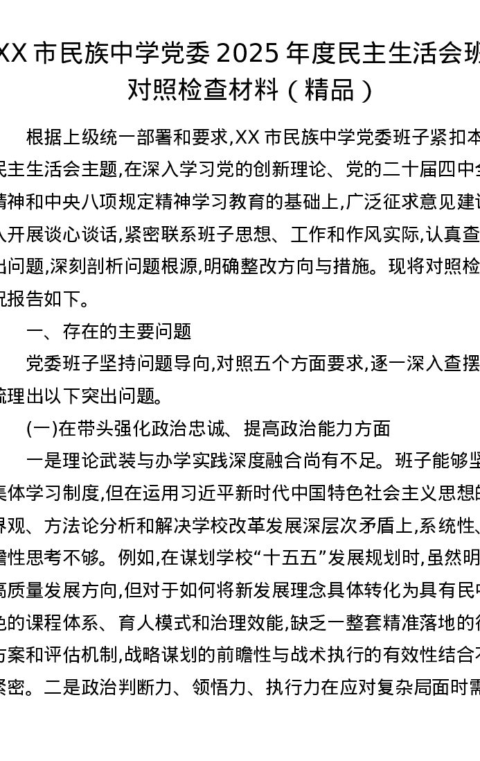XX市民族中学党委2025年度xxxxx班子对照检查材料