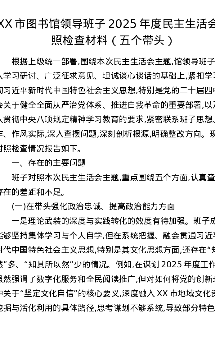 XX市图书馆领导班子2025年度xxxxx对照检查材料(五个带头)