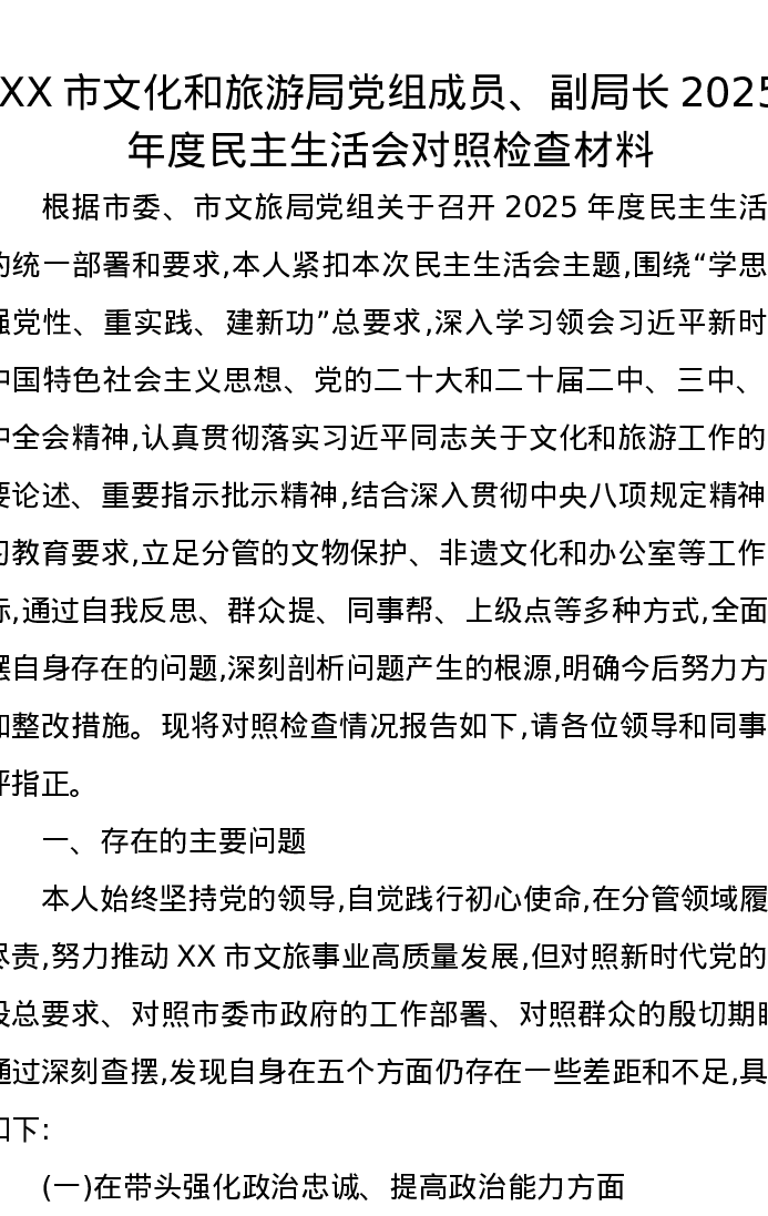 XX市文化和旅游局党组成员、副局长2025年度xxxxx对照检查材料