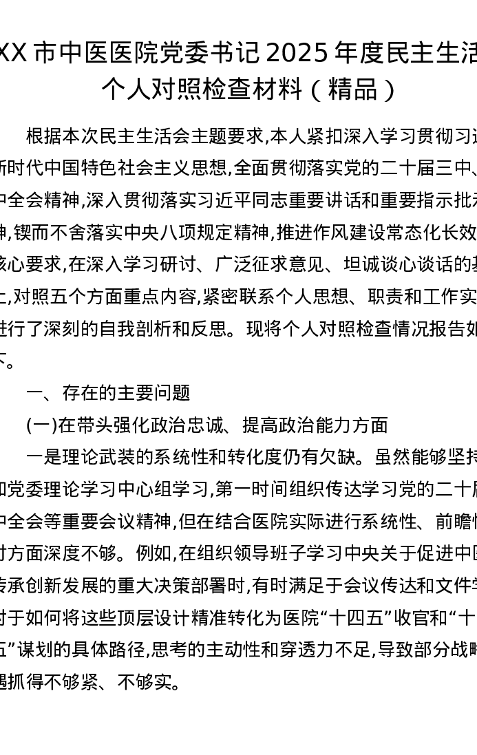 XX市中医医院党委书记2025年度xxxxx个人对照检查材料