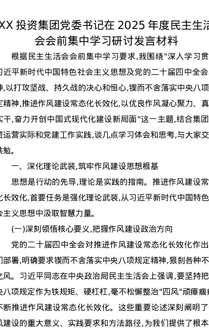 XX投资集团党委书记在2025年度xxxxx会前集中学习研讨发言材料